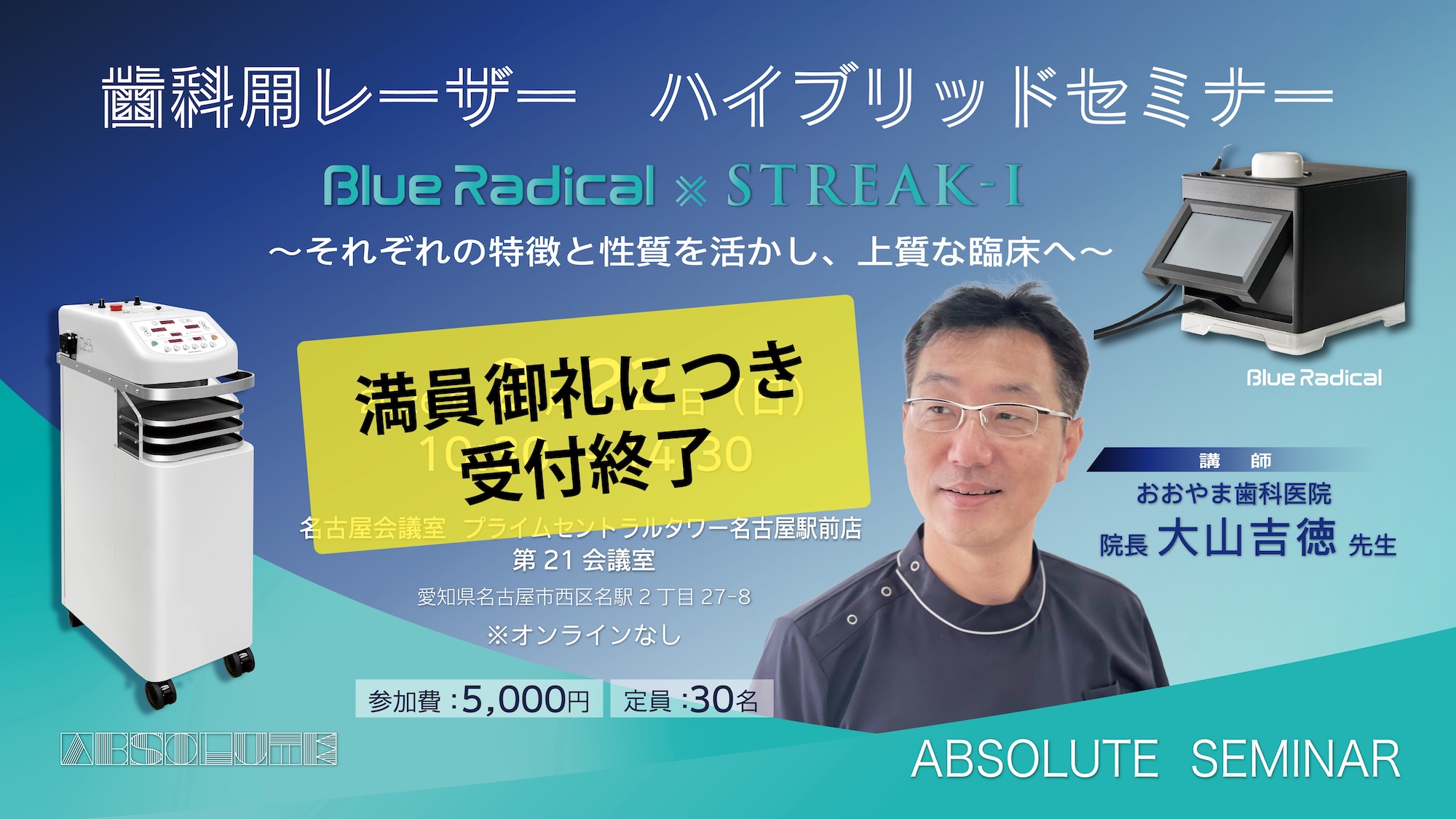 本セミナーでは、《Blue Radical》と《STREAK-Ⅰ》によるハイブリッド治療をテーマに、症例を交えながら、それぞれの特性と応用について解説し、明日からの臨床に活かせる実践的な活用方法をご紹介します。また、会場では実際に機器を操作していただく実習も予定しております。
