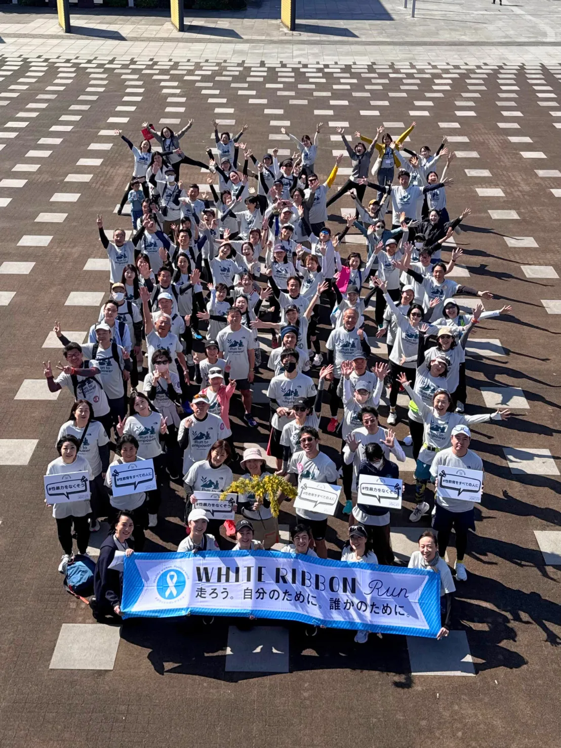 当日は横浜のベイエリアを舞台に、波止場会館をスタート地点として、大桟橋や象の鼻パーク、山下公園といった横浜を代表するスポットを巡るコースでラン&ウォークが行われました。多くの参加者の皆様とともにホワイトリボン運動のメッセージを発信し、社会課題への理解を深める貴重な機会となりました。